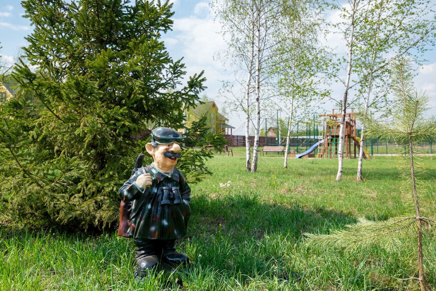- Въездная группа, шлагбаум, общее ограждение, место для сбора мусора, детская площадка, спортивная площадка;